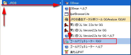 まず ゴールドジェネレーター を起動しましょう。 (すでに起動している場合は、に進んでください。) 画面左下の [スタート] ボタンを押し、 [プログラム(P)] → [JRDB] → [ゴールド・ジェネレータ for JRDB (GG)] の順に押してください。 次へ