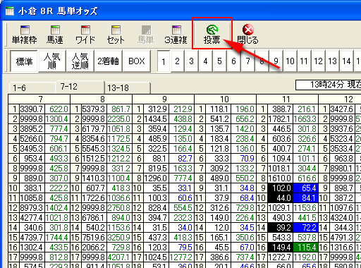 買いたいオッズを押して選択してください。 (選択すると、色が変わります。) 選択が終わったら、[投票] ボタンを押して下さい。 次へ